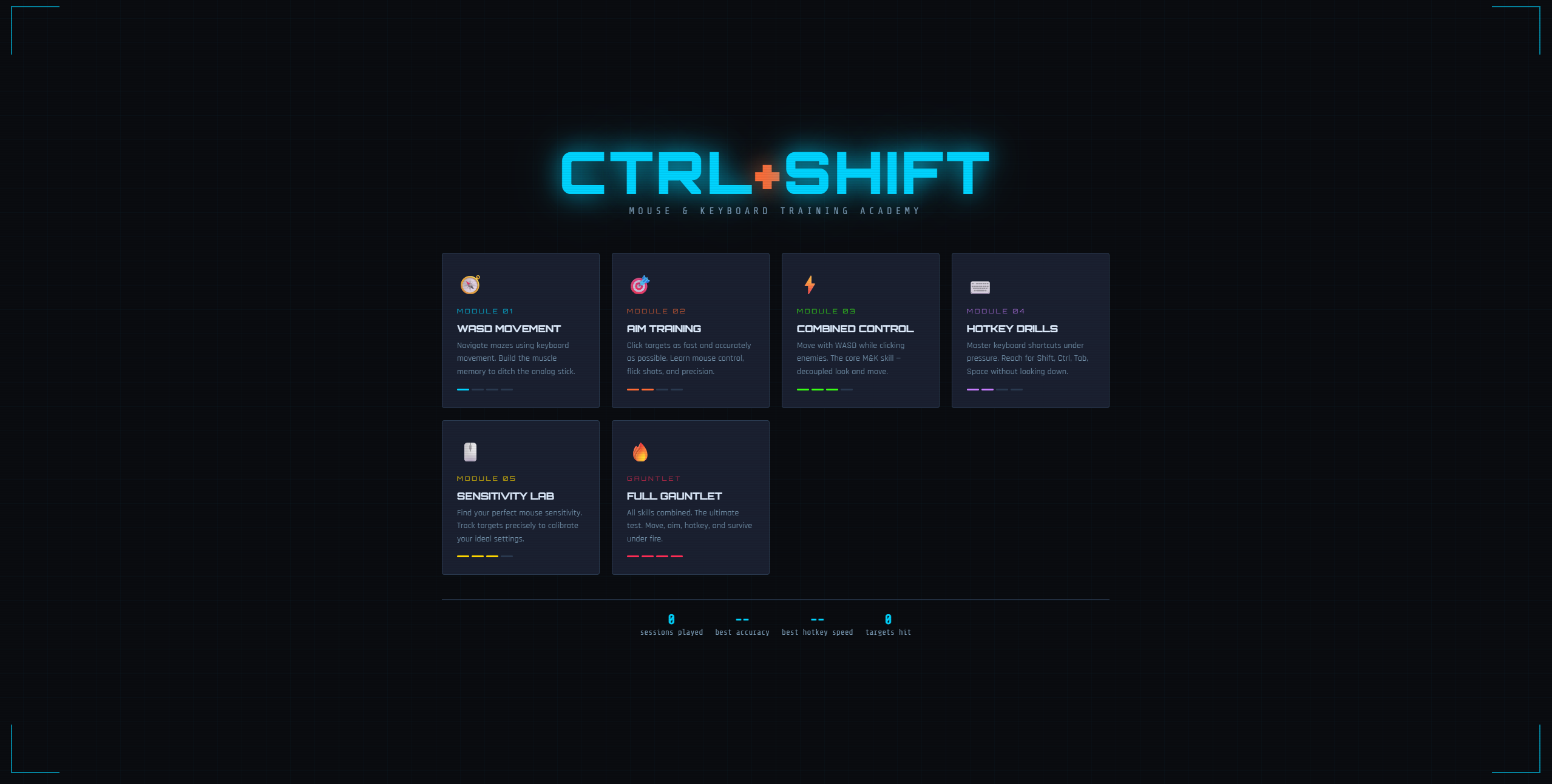 CTRL+SHIFT is a browser-based training game designed to improve your mouse and keyboard mechanics through fast, repeatable skill drills.